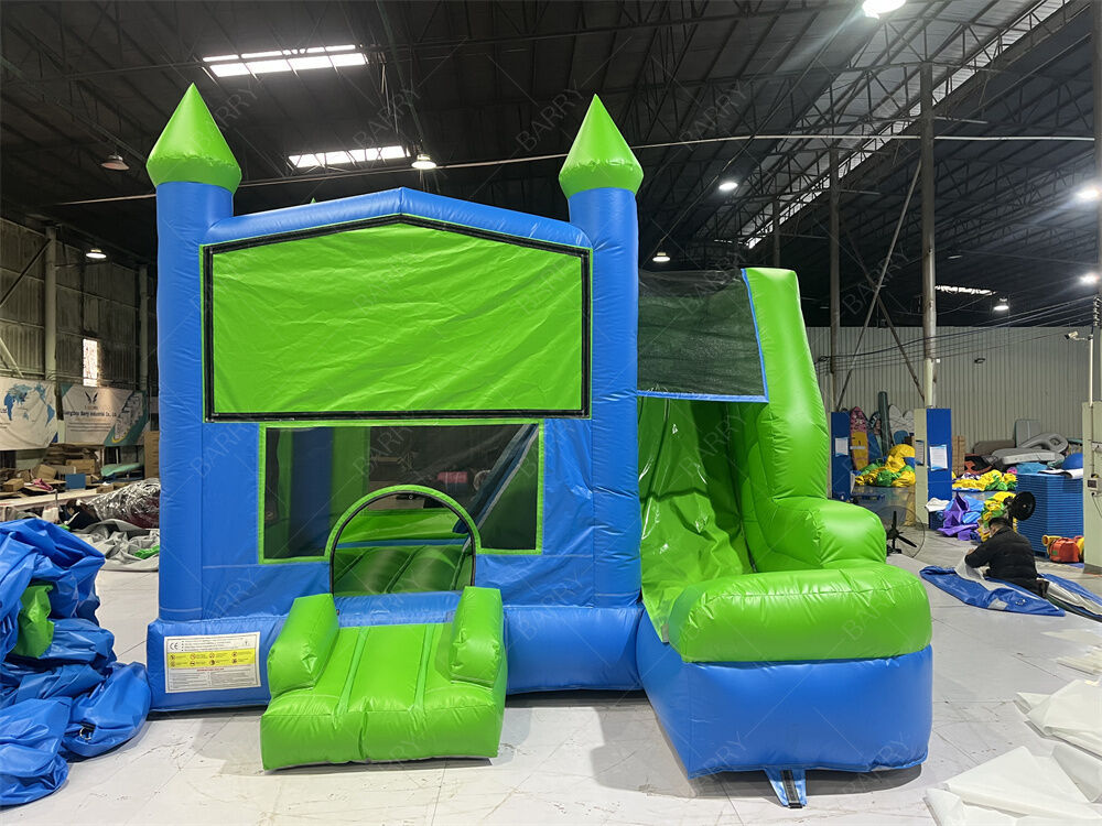 Esta casa inflable con tobogán de estilo clásico es una adición versátil y de alto rendimiento a cualquier inventario de alquiler de fiestas, patio trasero familiar o evento comercial.panel frontal de lona en blanco y color azul-verde en negrita, ofrece infinitas posibilidades de personalización para adaptarse a sus necesidades de marca, tema o evento.